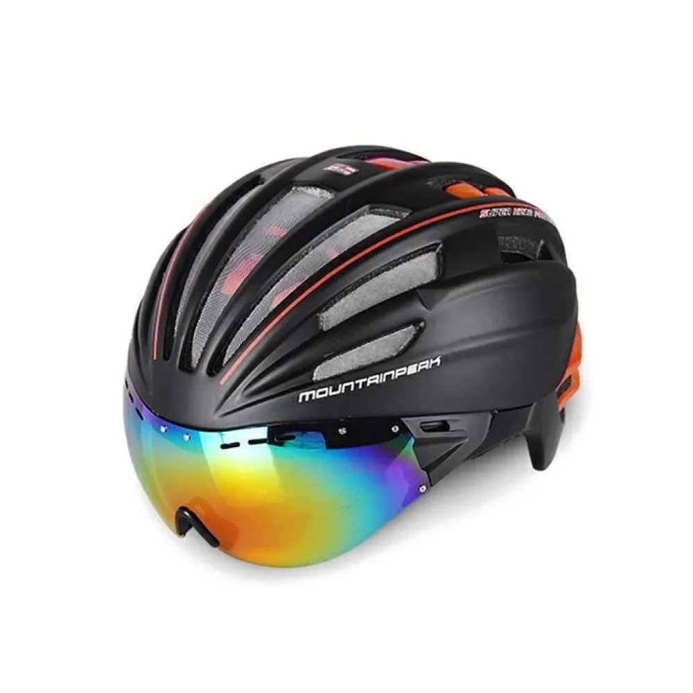 Шлем велосипедный MountainPeak RACE X – крутой и модный с вентиляционными отверстиями считается лучшим предложением этого года. Дизайн привлекает внимание, делает аксессуар заметным в сравнении с другими моделями. Наличие в комплектации съёмный зеркальных очков подчеркивает особые требования райдера к аксессуарам. Покупка шлема гарантирует стопроцентную безопасность головы и защиту райдера от попадания пыли при продолжительной езде. Купить шлем по лучшей стоимости воспользоваться бесплатной поддержкой и другими приятными бонусами производителя предлагает наш интернет-магазин.