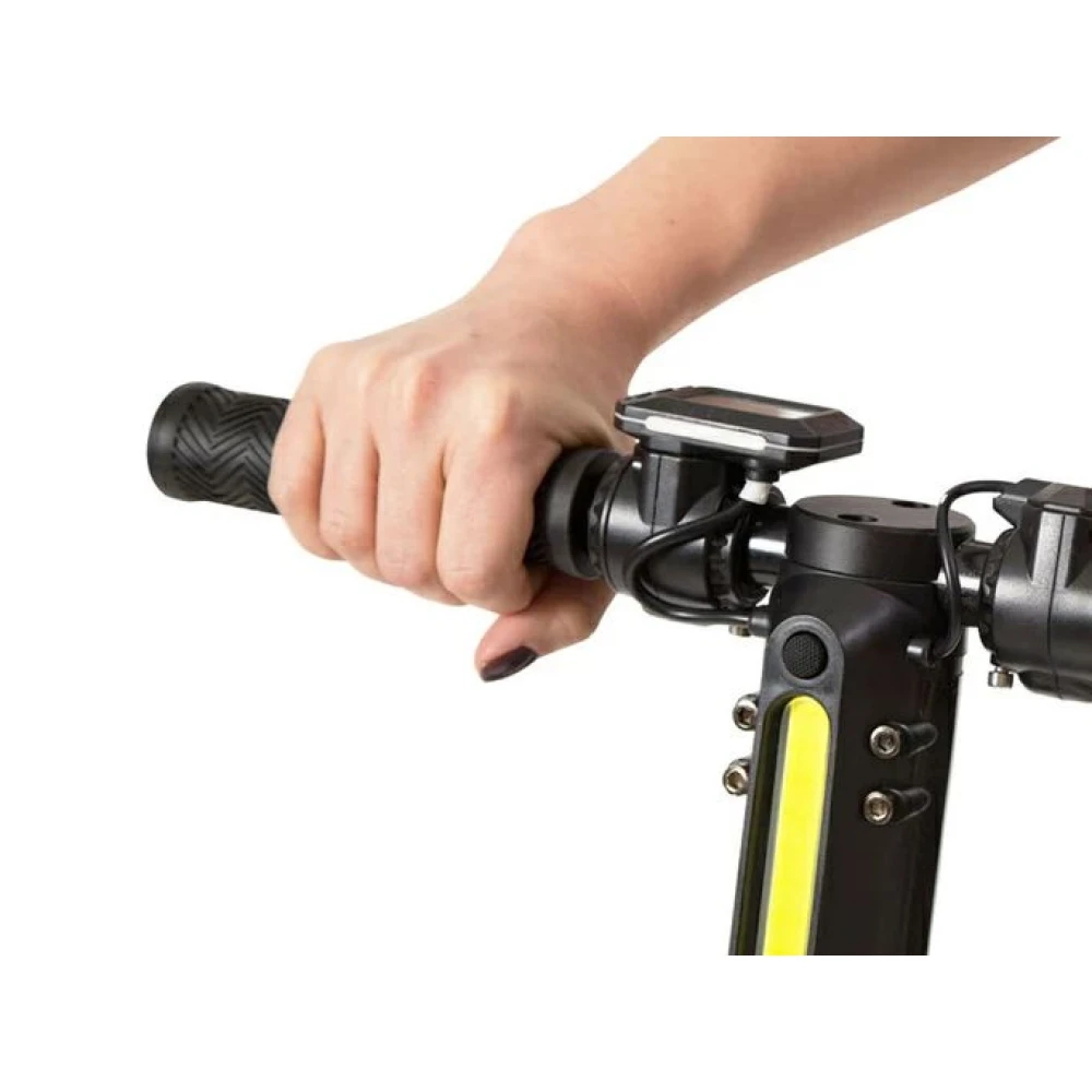 Дека – широкая, нескользящая, исключает неправильные действия ездока при длительном путешествии. Рулевая стойка складывается, быстро трансформируется в удобные для переноски размеры. Колесная часть небольшая – 5.5 дюймовая, мало стираемая. Контроль скоростных характеристик и других параметров осуществляется с помощью бортового компьютера, размещенного в левой части руля.
