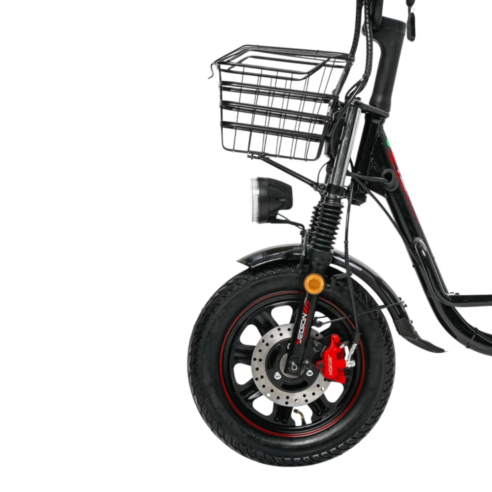 Рама выполнена из стали, что обеспечивает высокую прочность и надёжность, особенно при активной городской эксплуатации и перевозке тяжёлых грузов. Размер рамы составляет около 120 см, а конструкция рулевой колонки – резьбовая, что упрощает обслуживание и регулировку. Вилка пружинно‑масляная, она хорошо сглаживает мелкие неровности асфальта и обеспечивает комфортную езду по городским дорогам и тротуарам. Колёса диаметром 16 дюймов сбалансированы между манёвренностью и устойчивостью, а классические педали позволяют использовать велосипед и в обычном (не только электрическом) режиме.