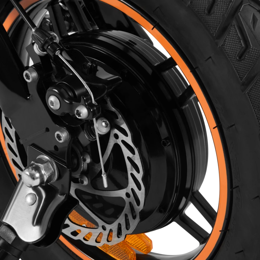 Надёжные дисковые тормоза гарантируют безопасность на любой скорости, а 14-дюймовые колёса обеспечивают устойчивость и уверенный ход. LED-фонарь освещает дорогу в тёмное время суток, а подножка добавляет удобства при парковке.