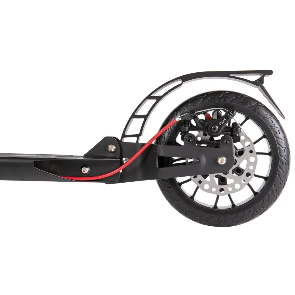 Самокат оснащен полиуретановыми мало стираемыми колесами с параметрами 200*30 мм. В сочетании с подшипниками класса ABEC 9 модель гарантирует отличный накат. Наличие дискового тормоза, амортизаторов и прорезиненных элементов делает езду безопасной, минимизирует риск падения.